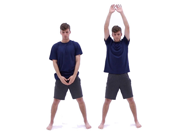 Start by standing up straight with your feet spread apart and your arms hanging in front of you. Slowly raise your arms straight out to the sides and up over your head as you inhale through your nose. Slowly exhale through your mouth as you lower your arms back down. 5 reps.
